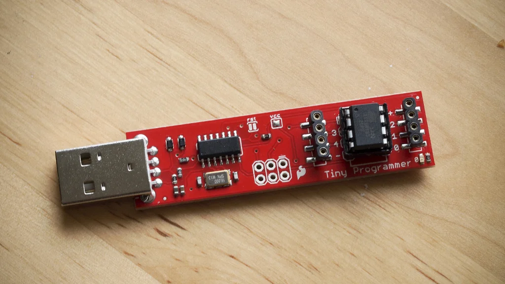 Insert the ATTiny85 into the Tiny AVR programmer. When inserting the microcontroller, make sure that the dot on the chip is on the same end as the notch illustrated on the USB stick (see Image 1).